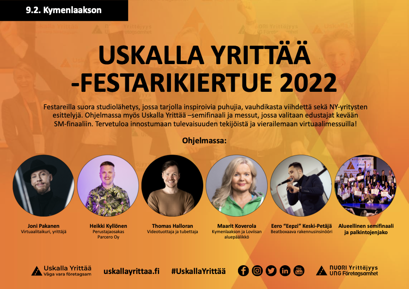 Uskalla yrittää festarikiertue starttaa 9.2. Kymenlaaksosta! Studiolähetys klo 11-13, jossa artistivieraita, yrittäjähaastatteluja ja inspiraatiota studion täydeltä. Klo 13 alkaa virtuaalimessut Howspacessa (linkki julkaistaan Uskalla yrittää sivuilla tapahtuma-aamuna.) Klo 14:45-15 parhaat yritykset palkitaan suorassa lähetyksessä!